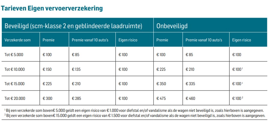 De premie van de eigen vervoersverzekering hangt af van de verzekerde som en de beveiliging van de auto. In onderstaande tabel vind je een overzicht.